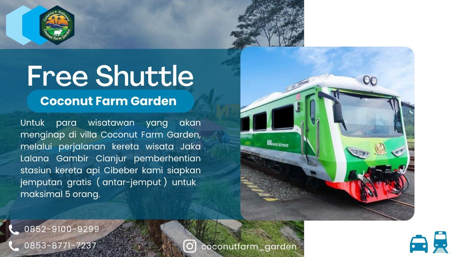 Nikmati wisata edukatif dan petualangan keluarga seru di Coconut Farm Garden Cianjur — destinasi alam di tengah kebun kelapa yang asri dan alami. Tersedia juga villa untuk menginap, cocok untuk liburan keluarga, rombongan, maupun staycation tenang di alam terbuka